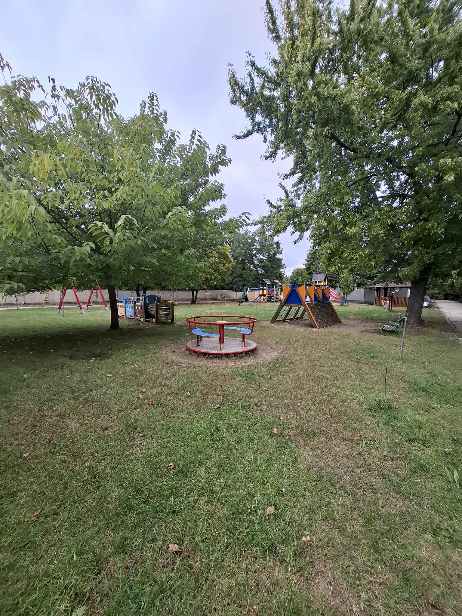 Az udvar tágas, mászókákkal, csúszdákkal, homokozóval és szabad füves területtel ellátott, biztosítva a gyermekek zavartalan mozgását. A sok fenyő- és hársfa kellemes mikroklímát teremt, különösen a nyári időszakban, amikor fontos a közvetlen napfény elleni védelem.